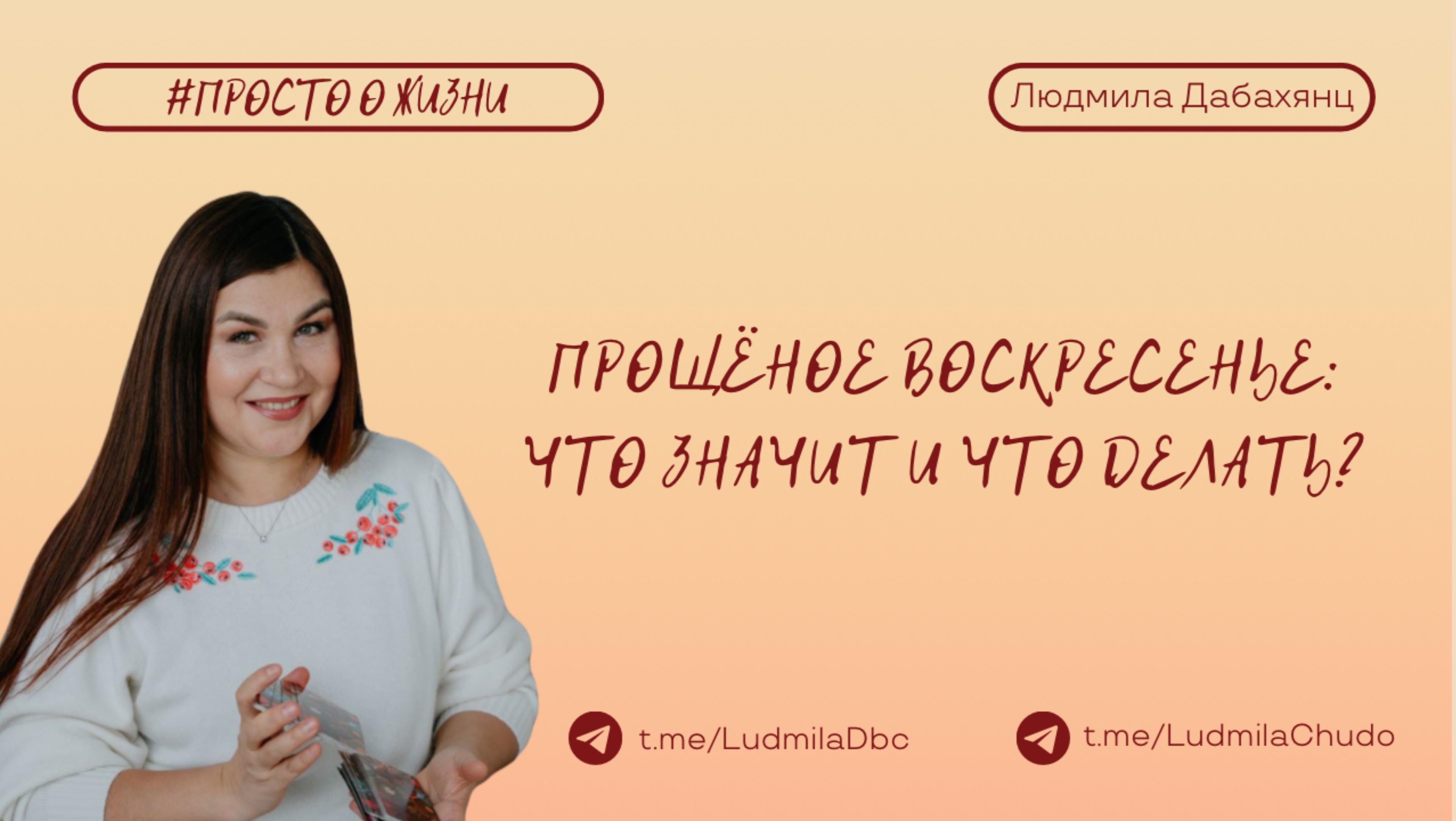 Рубрика #ПРОСТО_О_ЖИЗНИ ВАЖНО: Уже в марте старт обучения работе с метафорическими картами. В основе обучения - метод вселенской терапии Л. Тальписа. Заходите в бот - https://t.me/ludmiladbc_bot и пишите "МАК", если хотите участвовать ‼️ канал #твАрец_реальности 2025 Подробнее: https://rutube.ru/video/2744940f7bab3063b818c926b2253dfc/ О канале: https://t.me/chatLudmilaChudo/4310 Заходите в бот - https://t.me/ludmiladbc_bot , если хотите участвовать Теперь в одном месте ты можешь посмотреть: ✔️ чем я могу быть для тебя и... ✔️ что я могу дать тебе Переходи: https://t.me/ludmiladbc_bot ✓ Обязательно поставь 💗 ✓ Подпишись на канал ✓ И поделись с близкими Это будет вашим балансом за движение и получение энергии. Если есть желание создать баланс брать-давать... приму от всего сердца с благословением (донейшн). С Огромной Любовью, Дабахянц Людмила 💓 ✨ Telegram: https://t.me/ludmiladbc ✨ Канал в telegram “Я ЕСТЬ”: https://t.me/LudmilaChudo ✨Мой бот в telegram: https://t.me/ludmiladbc_bot ✨Онлайн-школа: https://ludmilachudo.skillspace.ru/school ✨Rutube: https://rutube.ru/channel/34371568/