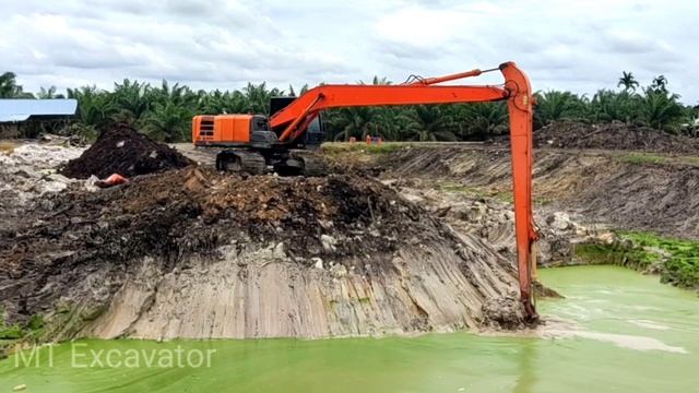long reach excavator hitachi zx200-5G proses menggali dua kolam jadi satu #excavatorlongarm #galikolam