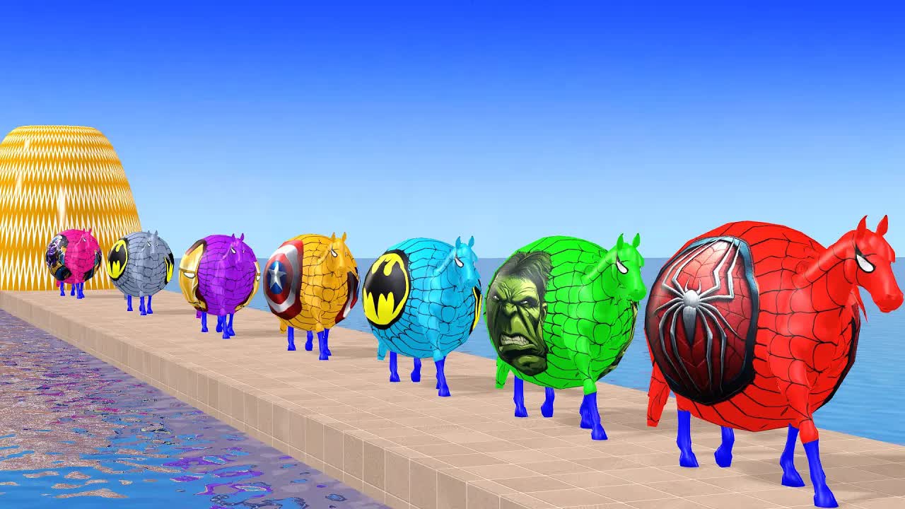 Человек-ПАУК на Красной ЛОШАДИ Пересекает РАДУЖНЫЙ ФОНТАННЫЙ мост с Лошадиными Супергероями, Спасающ
