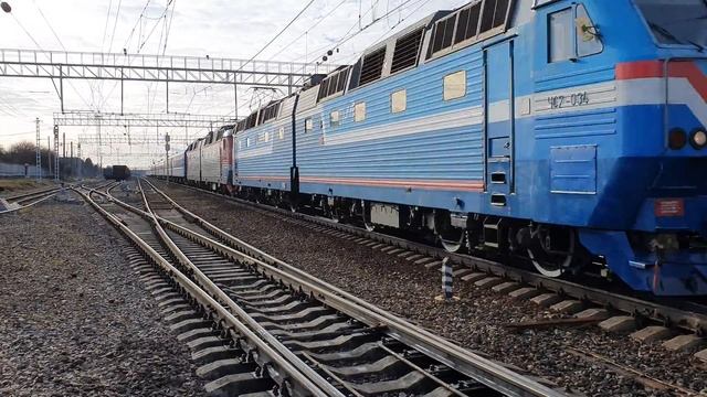 синий ЧС7-034+ЧС7-107 с поездом №96 Брест-Москва свистит и влетает на станцию