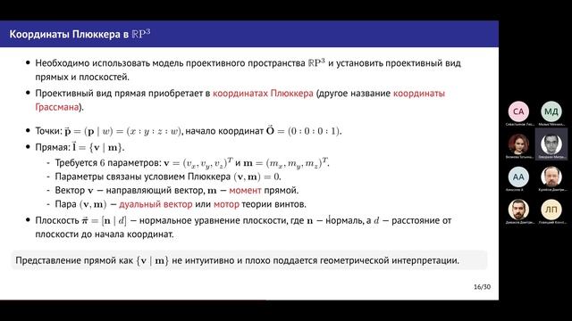https://events.rudn.ru/event/218/ Применение проективной геометрии в компьютерной графике М. Н. Геворкян Доцент кафедры Прикладной информатики и теории вероятностей, РУДН Данный доклад носит методологический характер. Авторы в процессе работы над пособием по компьютерной геометрии столкнулись с проблемой изложения основных принципов проективной геометрии в линейно-алгебраическом виде, доступном для студентов второго курса физико-математических специальностей. Основной задачей компьютерной графики является реалистичное изображение. окружающего мира. Прямые в виде отрезков, плоскости в виде многоугольников, а также точки в виде вершин, являются базовыми объектами для построения полигональных трехмерных моделей в компьютерной графике. Задачи определения положения точек, прямых и плоскостей в пространстве относительно друг-друга являются основой всех алгоритмов компьютерной графики. Отличительной особенностью работы является применение однородных координат к описанию точек, прямых и плоскостей. Для прямых и плоскостей такие координаты также носят название координат Плюккера и в случае с прямыми тесно связаны с теорией моторов и винтов. Ключевое преимущество данного подхода является отсутствие исключительных случаев, так как в проективном пространстве все прямые пересекаются в конечной или идеальной точках, а все плоскости по конечной или идеальной прямым. С точки зрения алгоритма это означает, что в вычислениях отсутствуют многочисленные дополнительные проверки и деление на ноль. В докладе используется большое количество рисунков созданных программным способом с помощью языка для векторной графики Asymptote. Это позволяет как на практике проверить корректность формул, так и обеспечить высокую степень наглядности материала. Application of projective geometry in computer graphics Migran N. Gevorkyan Department of Applied Informatics and Probability Theory, RUDN University This report is methodological in nature. While working on the manual on computer geometry, the authors faced the problem of presenting the basic principles of projective geometry in a linear-algebraic form accessible to second-year students of physics and mathematics specialties. The main task of computer graphics is a realistic image. the surrounding world. Straight lines in the form of segments, planes in the form of polygons, as well as points in the form of vertices, are the basic objects for constructing polygonal three-dimensional models in computer graphics. The problems of determining the position of points, lines and planes in space relative to each other are the basis of all computer graphics algorithms. A distinctive feature of the work is the application of homogeneous coordinates to the description of points, lines and planes. For straight lines and planes, such coordinates are also called Plucker coordinates and, in the case of straight lines, are closely related to the theory of motors and screws. The key advantage of this approach is the absence of exceptional cases, since in a projective space all lines intersect at finite or ideal points, and all planes intersect along finite or ideal lines. From the point of view of the algorithm, this means that there are no numerous additional checks and division by zero in the calculations. The report uses a large number of drawings created programmatically using the language for vector graphics Asymptote. This allows both to verify the correctness of the formulas in practice and to ensure a high degree of clarity of the material.