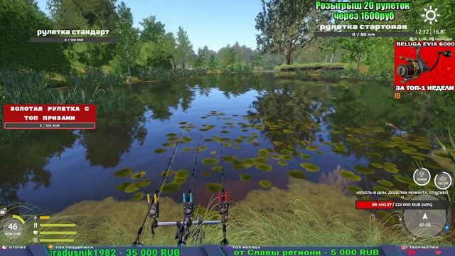 Поддержка донатом https://www.donationalerts.com/r/kalyamba11 Альтернативный донат https://new.donatepay.ru/@1032463 Если стрим лагает,смотри стрим на трово https://trovo.live/s/Kalyamba_na_Ribalke Мой ВК - https://vk.com/kalyantv НИК в игре kalyan11 НАШ ДИСКОРД СЕРВЕР https://discord.gg/mSbnTJK8TB Заказ водоема на 1 час - 500р ( весь стрим 2500р ) Модерка на канале 1200р ( каждая следующая на 100р больше) Озвучка доната на 40р,50р,100р,200р,300р,500р,1000р ✅Призы в рулетке "ЗОЛОТАЯ" ✔ ЗОЛОТО ✔ ПРЕМ ✔ КАТУШКИ РАПТОР 40, АЗИМУТ 10000, СИЛЬВЕР 80, ТАЙГА с 30 ЮБИЛЕЙНАЯ, ✔ ПАЛКИ ПИЛКЕРНАЯ, ДОНКА МОРСКИЕ, ✔ РОД ПОД, СТУЛЬЯ ✅Призы в рулетке СТАНДАРТ : ✔ катушка "РАПТОР 40" ✔ катушка "АЗИМУТ 10000" ✔ катушка "ТАЙГА С30, С40, С30 (юбилейная)" ✔ катушки 60 для медного ( ЭВИИ, НАТОРЫ, ГОЛДА, и тд) ✔ ПИЛКЕРНОЕ УДИЛИЩЕ КОРОЛЕВА ОКЕАНА ✔ Морское Донное удилище ✔ прем ( 3, 7, 30 дней) ✔ золото ( 1, 3, 5, 10, 20 ,50) ✔ билет на море ( 1, 3, 5 дней) ✔ голд наживка и др. ✅Призы в рулетке "СТАРТОВАЯ" ✔ катушка "silver80" ✔ катушка "БЕЛЫЙ КАЛИБР" ✔ катушка "Черный калибр" ✔ катушка "Протон" ✔ катушка "Нарга 6000" ✔ Набор Фидерист и спинингист ✔ Карповик Фортуна ✔ фидерные удилища ✔ прем, золото, алкашка, наживки и тд P.s Рулетка это не казино, а награда за поддержку стримера. Вечный ТОП ПОДДЕРЖКИ (11.05.2024) 1. Dimon_pokemonchik 119 784 2. Interceptor 75 508 3. Skreb79 71 261 4. une personne 68 619 5. Нарвал77 31 550