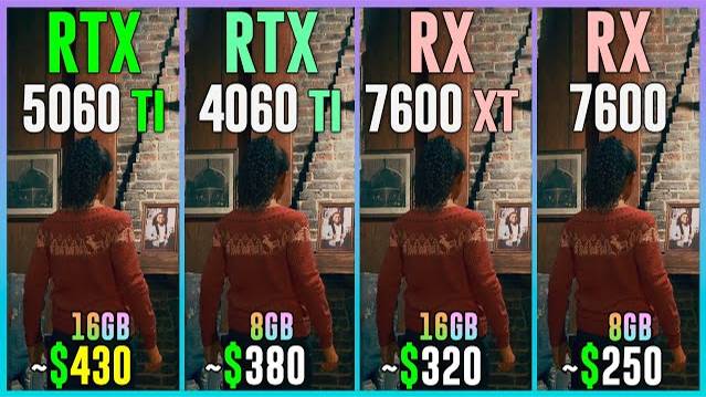 RTX 5060 TI 16GB vs RTX 4060 TI vs RX 7600 XT vs RX 7600 - Test in 20 Games 1080p, 1440p, 2160p, 4k, 2k, dlss 4, dlss 3.7, fsr 4, fsr 3.1, ray tracing, frame generation, native, Multi Frame Generation, The Last of Us Parte II Remastered PC ⏩GPUs & Amazon US⏪ (Affiliate links) 💥RTX 5060 TI 16GB: https://amzn.to/3Ek0uyh 💥RTX 4060 TI 8GB: https://amzn.to/3NldmFR 💥RX 7600 XT 16GB: https://amzn.to/4atnQfm 💥RX 7600 8GB: https://amzn.to/4atnQfm ⏩PC Setup⏪ - OS: Windows 11 Professional 64-bit - CPU: Ryzen 7 9800X3D - MB: GIGABYTE X870 AORUS Elite - RAM: Corsair Vengeance RGB 32GB DDR5 - 6400 Mhz CL32 💁♂️ When you buy from my Amazon links, I earn a small commission at no extra cost to you, plus you support the channel thank you.
