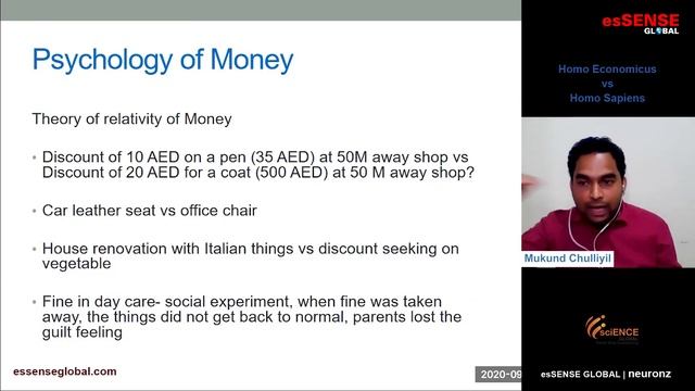 ഹോമോ എക്കണോമിക്കസ് vs ഹോമോ സാപ്പിയൻസ് Homo Economicus vs Homo Sapiens (Malayalam) - An Introduction to Behavioral Economics Talk by Mukund Chulliyil Organised by sciENCE Global UAE Editor: Hari Mukhathala esSENSE Telegram Channel for Instant Program & Video Alerts: http://t.me/essensetv esSENSE Social links: Website of esSENSE: http://essenseglobal.com/ Website of neuronz: http://neuronz.in FaceBook Group: https://www.facebook.com/groups/esSENSEGlobal/ FaceBook Page of esSENSE: https://www.facebook.com/essenseglobal/ FaceBook Page of neuronz: https://www.facebook.com/neuronz.in/ Twitter: https://twitter.com/esSENSEGlobal Podcast: http://podcast.essenseglobal.com/ #Behavioral #Economics