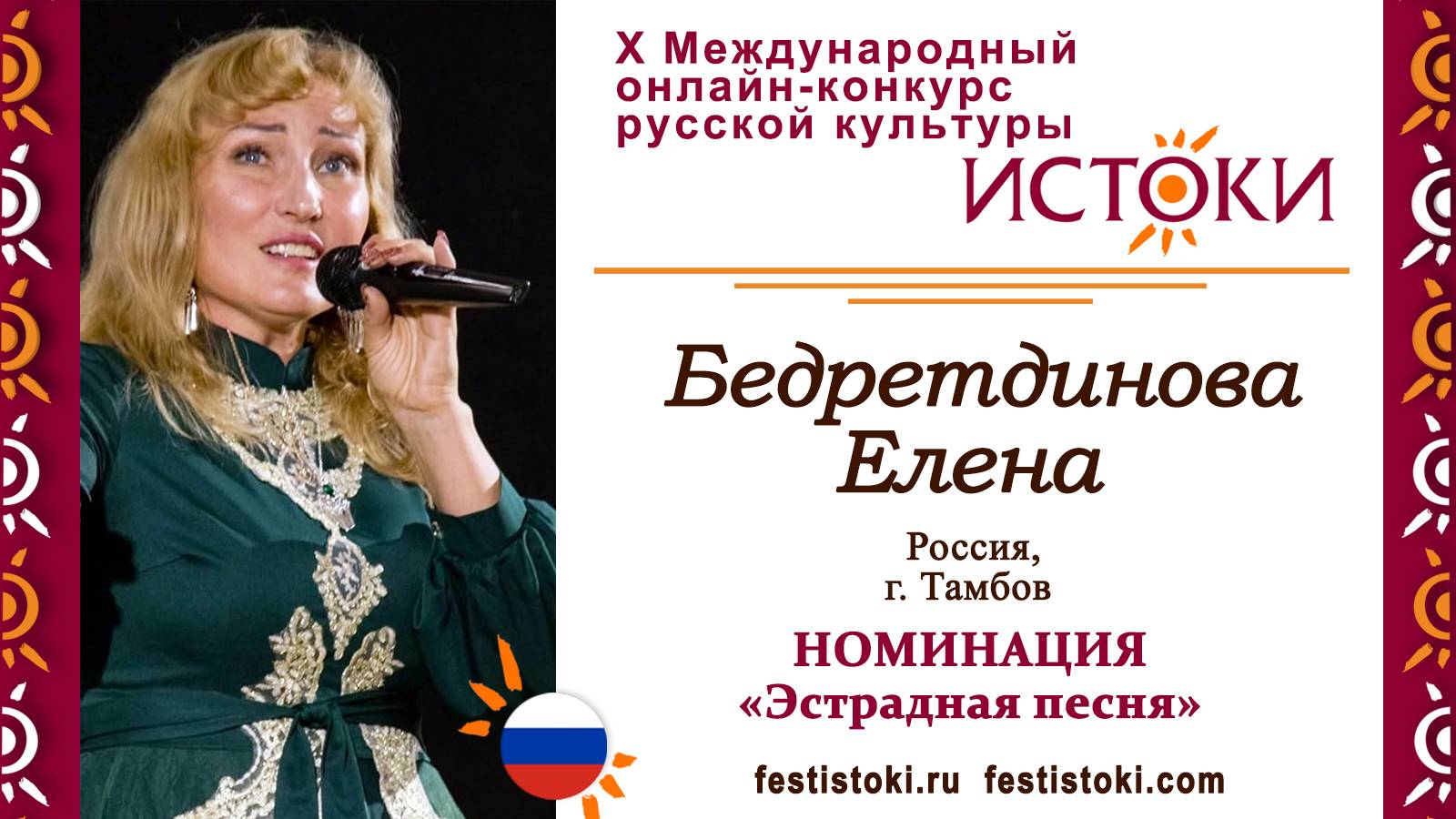 Участник Х Международного онлайн-конкурса русской культуры "Истоки". Номинация "Эстрадная песня". Песня "Крылатые качели". Автор слов Юрий Энтин, композитор Евгений Крылатов. Сайт: festistoki.ru / festistoki.com E-mail: festistoki@mail.ru