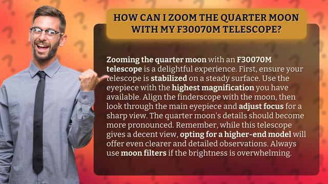 Zooming the Quarter Moon: A Delightful Experience with the F30070M Telescope • Zooming the Quarter Moon • Discover the joy of zooming the quarter moon with an F30070M telescope. Learn how to stabilize your telescope, use the highest magnification eyepiece, align the finderscope, and adjust focus for a sharp view. Enhance your observation with higher-end models for clearer and more detailed views. Don't forget to use moon filters to handle overwhelming brightness. Watch now and explore the wonders of the night sky!