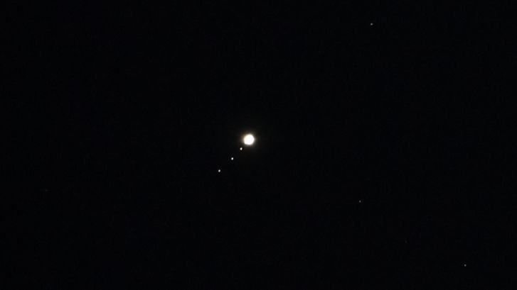 Юпитер с хвостом из спутников сегодня. Каллисто, Европа, Ио, Ганимед.