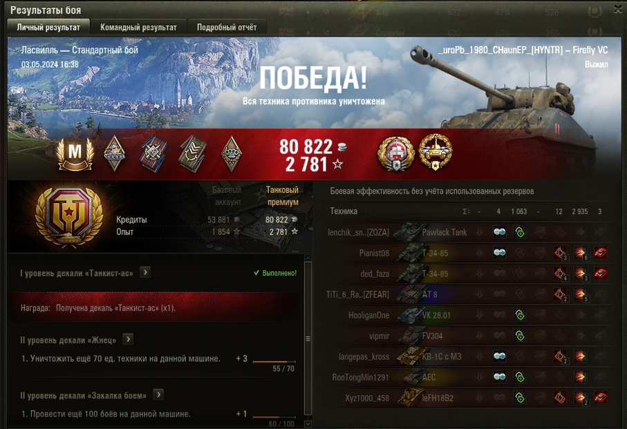 ЛАСВИЛЛЬ МАСТЕР на Sherman VC Firefly ОПЫТ: 1426 СУММАРНЫЙ УРОН: 3998 медаль КАЛИБР СНАЙПЕР