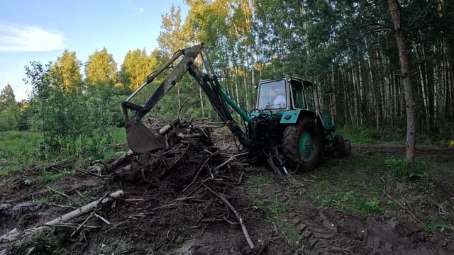 Первый раз решил попробовать убрать кучу корней, которые оставил нам Каматсу. Работа ковшом первый раз. Кое что получилось. Но лопнула магистраль металлическая высокого давления.