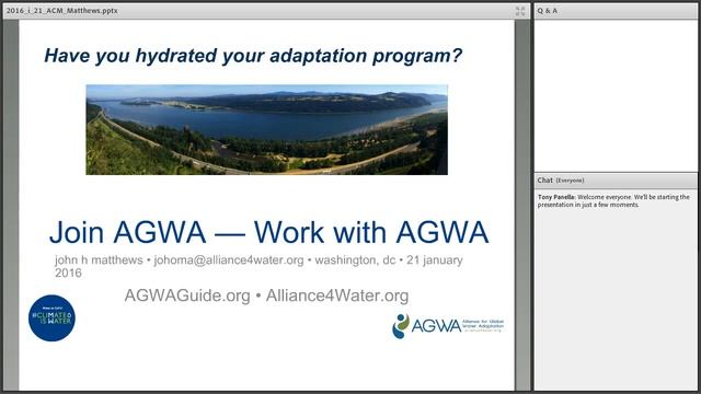 On January 21, 2016, USAID's Adaptation Community held a meeting on connecting freshwater to climate practice with Dr. John Mathews from the Alliance for Global Water Adaptation. Most expressions of climate change are water change, and primarily freshwater change. Freshwater changes, including variations in water flows and seasonal precipitation patterns, are a major way that climate change impacts natural ecosystems and economies. Many aspects of climate change adaptation must focus on resilient water management in order to be effective. However, the long lifetimes of water infrastructure such as dams, and the complexity of water stakeholder interests, are just some of the factors that have led to an under-appreciation of the important cross-sectoral role of water management in effective climate change adaptation. Dr. Matthews will discuss concrete examples of how programming that addresses engineering, financial, and public policy elements of water management can and must lead to shared insights and new paths of action for adaptation to changes in freshwater dynamics resulting from climate change. Bio: Dr. John H. Matthews is the Secretariat Coordinator and co-founder for the Alliance for Global Water Adaptation (AGWA; http://alliance4water.org), which is chaired by the Stockholm International Water Institute (SIWI) and the World Bank and includes some 800 technical and policy members globally. An aquatic ecologist by training, his work integrates technical and policy knowledge to support resilient resource management, climate - robust infrastructure operations, and economic development. Matthews has published widely for technical, practitioner, and general audiences, including recent articles in Science and Nature Climate Change and reports for the World Bank and UN agencies. AGWA also maintains a capacity building and learning site at http://agwaguide.org
