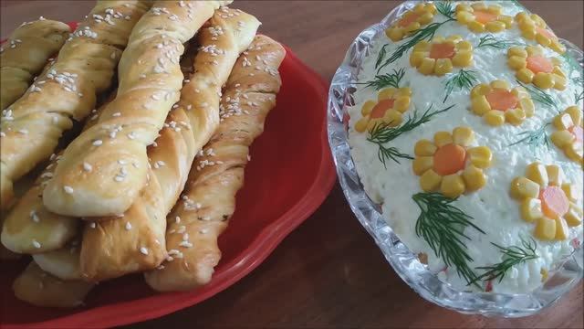 Салат с крабовыми палочками и копченным сыром. Хлебные палочки с кунжутом и чесноком