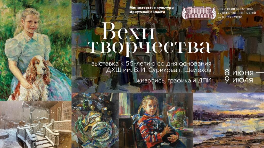 Выставка приурочена к 55-летию со дня основания Детской художественной школы им. Сурикова в Шелехове, а также к Году педагога и наставника. В экспозиции — более 50 произведений авторства преподавателей школы. Все педагоги детской художественной школы — талантливые люди, профессиональные художники. Они ведут активную творческую деятельность, а также имеют большое количество наград и званий. Среди участников выставки заслуженный художник РФ Геннадий Шихалев, лауреаты Премии губернатора Иркутской области: директор ДХШ Марина Алферова, Галина Заграничная, Людмила Кузьменко, Наталья Мишурина; члены Союза художников России Андрей Ростовцев, Наталья Кунаева, а также многие другие профессиональные педагоги и художники. Выставка «Вехи творчества» собрала в одном выставочном пространстве разных мастеров сибирского пейзажа, которые демонстрируют красоту, богатство и величие нашей природы. В экспозиции зритель сможет увидеть различные художественные техники, в которых работают современные художники Детской художественной школы им. В. И. Сурикова.