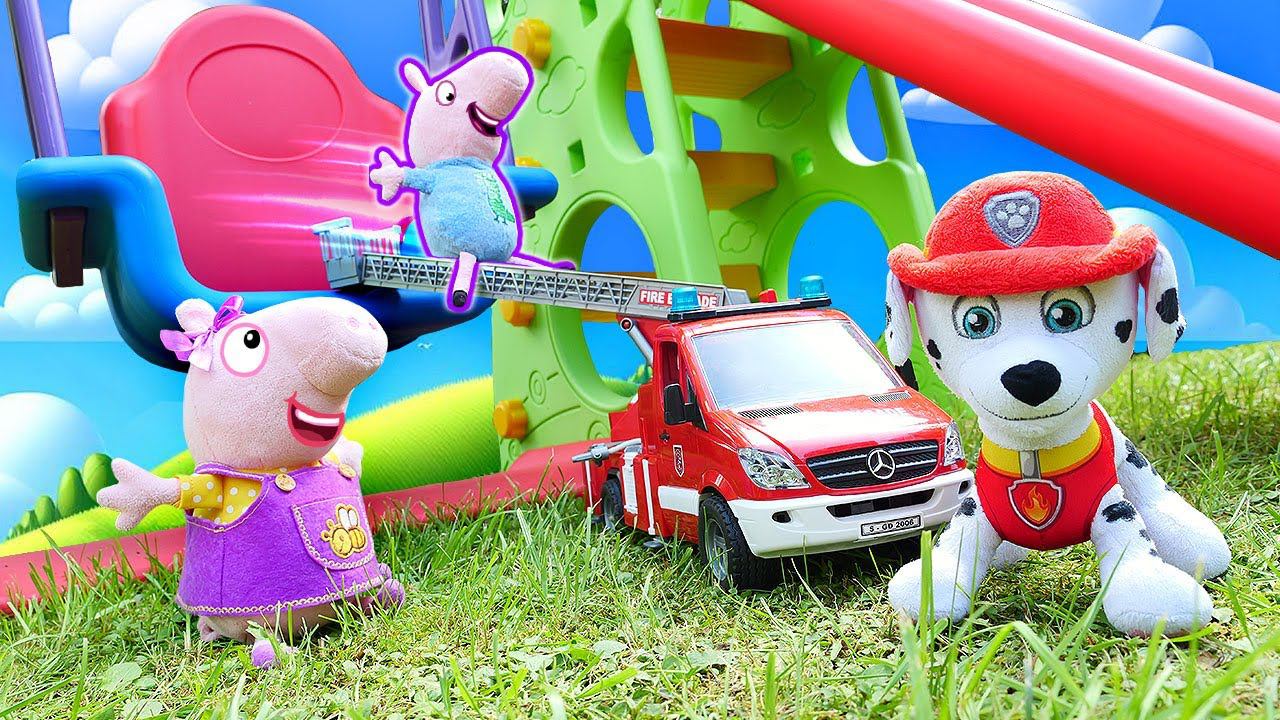 Игрушки Свинка Пеппа и Джордж качаются на качелях. Плюшевые игрушки в видео для детей