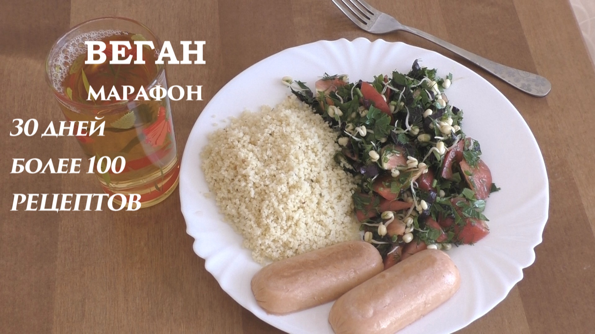 Сардельки с кускусом и салатом из помидор и пророщенного маша. Веганский марафон. Обед. День 8
