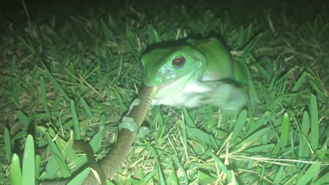 Зеленая квашка пробует проглотить змею. #лягушка #змея #пасть