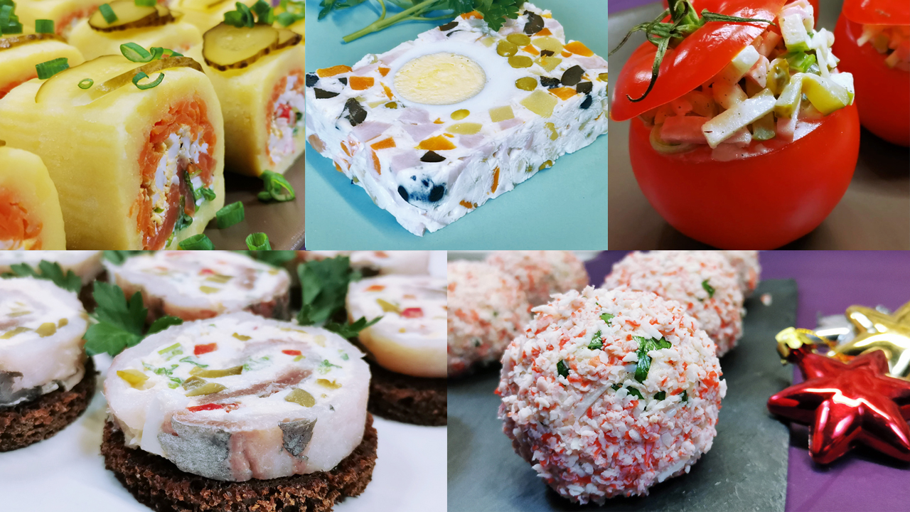 Несколько очень красивых и оригинальных закусок на праздничный стол и на каждый день, которыми можно удивить гостей и при этом они готовятся совсем несложно. 5 коротких и легких рецептов отличных закусок из простых продуктов. Ингредиенты для каждого рецепта есть в видео, но для удобства можно посмотреть их тут, также, как и временной интервал для каждого отдельного рецепта: 1. "Снежки" из крабовых палочек 00:00-00:56 Ингредиенты на 6 шт.: Крабовые палочки - 200 гр Сыр - 100 гр Яйца - 2 шт. Петрушка - 2-3 веточки Чеснок - 1 зубчик Майонез - 60 гр Соль и перец - по вкусу 2. Рулеты из салата с красной рыбой и крабовыми палочками 00:57-02:08 Ингредиенты на 2 рулета по 24 см (12 порций): Крабовые палочки - 4 шт. Соленая красная рыба - 70 гр Вареная картошка - 4 шт. Вареная морковь - 1 шт. Вареные яйца - 2 шт. Зеленый лук - 4 стрелки Соленые огурцы - 2-3 шт. Майонез, соль и перец - по вкусу 3. Голландский салат с ветчиной в помидорах 02:09-03:00 Ингредиенты на 9-10 порций: Помидоры среднего размера - 9-10 шт. Ветчина - 200 гр Маринованные огурцы - 150 гр Сыр - 150 гр Зелёный лук - 30 гр (3 стрелки) Яблоки зелёные кислые - 150 гр Майонез - 90 гр (3 большие ст.л. с большой горкой) Чёрный перец - по вкусу и желанию 4. Заливной закусочный Оливье 03:01-04:10 Ингредиенты для формы 25х10 см: Для заправки Майонез - 3 ст.л. Сметана 15% - 4 ст.л. Горчица - 2 ч.л. Желатин - 20 гр Жидкость из зеленого горошка - 150 мл Для салата Колбаса вареная или ветчина - 200 гр Картофель вареный - 250 гр Морковь вареная - 200 гр Горошек зеленый - 100 гр Маслины без косточки или любые огурцы- 100 гр Яйца вареные- 5 шт. Соль - по вкусу 5. Рулеты из сельди с сырной начинкой 04:11-05:23 Ингредиенты на 2 рулета по 20 см (16-18 порций): Филе сельди - 400 гр Мягкий творожный сыр - 140 гр Любой плавленый сырок - 90 гр Соленые огурцы - 90 гр Красный болгарский перец - 40 гр Вареные яйца - 2 шт. Зеленый лук - 30 гр *************************************************************************************************** Посмотреть еще мои новые рецепты горячих блюд на праздничный стол и на каждый день: 1️⃣▶ КАРТОШКА ПО-ФРАНЦУЗСКИ шикарный гарнир и сытный ужин ГРАТЕН ДОФИНУА https://www.youtube.com/watch?v=i0Bqh... 2️⃣▶ КУРИНУЮ ГРУДКУ вместо майонеза СМАЗЫВАЕМ ВАРЕНЬЕМ и получается еще вкуснее https://www.youtube.com/watch?v=86Q1s... 3️⃣▶ НОВОЕ горячее блюдо к Новому году. ИДЕАЛЬНЫЙ КРОЛИК ПО-ФРАНЦУЗСКИ на праздничный стол https://www.youtube.com/watch?v=EbqTd... 4️⃣▶ ГЛАВНОЕ блюдо на Новогодний стол МЯСО В ГОРЧИЦЕ очень простой и красивый рецепт https://www.youtube.com/watch?v=bpUaj... 5️⃣▶ Вкусное красивое блюдо ИЗ КУРИНОЙ ГРУДКИ с помидорами и сыром. Простой рецепт на ужин и на праздник https://www.youtube.com/watch?v=Qwd9B... ***************************************************************************** Одноклассники https://ok.ru/group/60739114565686 Яндекс Дзен https://zen.yandex.ru/rozovybaklazan Facebook https://www.facebook.com/groups/30739... Яндекс Эфир https://yandex.ru/efir/?stream_active... Ютуб https://www.youtube.com/c/РозовыйБаклажан/featured ***************************************************************************** Музыкальная композиция: My Achy Heart Автор: Audio Hertz Ссылка на исполнителя: https://www.youtube.com/channel/UCQwack29qZerCwaELoR3bLg Музыка, продвигаемая музыкальной библиотекой Happy Soul https://happysoulmusic.com https://happysoulmusic.com/audio/my_achy_heart_-_audio_hertz-mp3/ #закуски #рецептызакусок #праздничныйстол #рецептынапраздник #рецептынакаждыйдень #вместооливье #закускиизкраснойрыбы #салаты #оливье #закускиизпростыхпродуктов #закускиизселедки #закускиизсельди #рецептыизкрабовызпалочек #рецептыизселедки #закускиизкрабовыхпалочек
