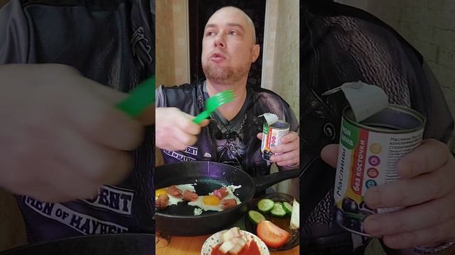 Мукбанг. Яичница с сосисками, сало с кетчупом и овощи. Еда на камеру.