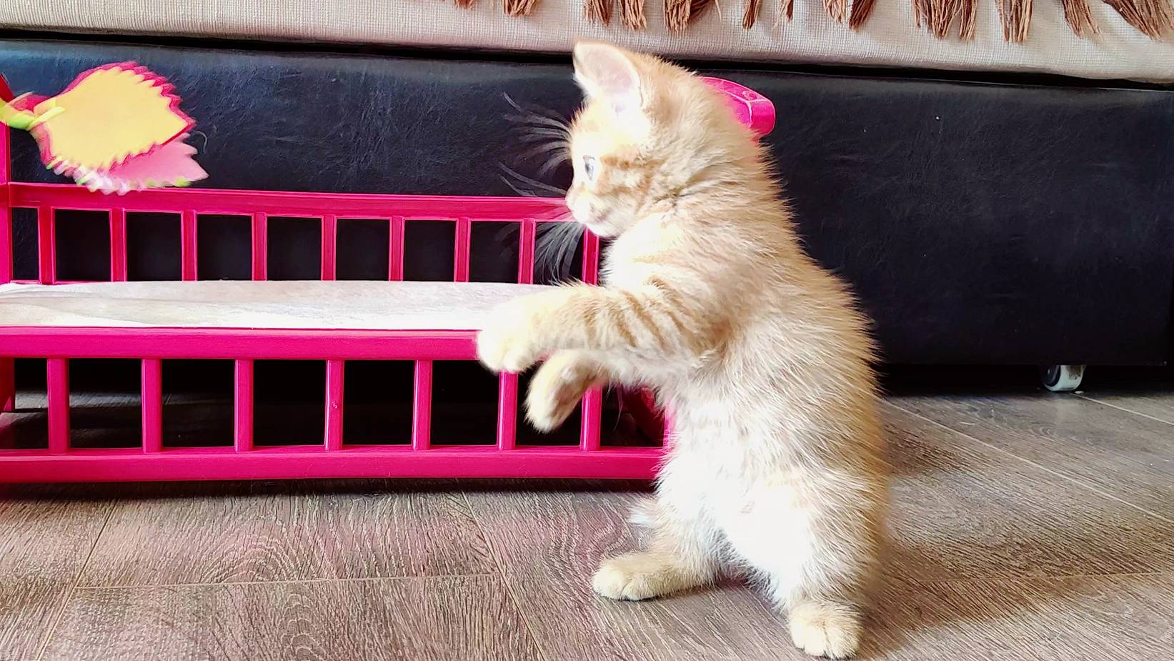 Красивый котенок играет с игрушкой.