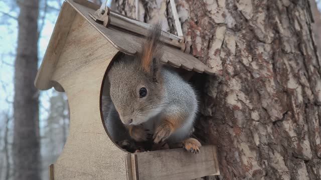 Две белки в кормушках грызут орехи