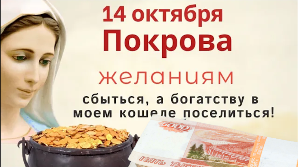 14 октября - Покров Пресвятой Богородицы. В этот день Можно попросить загадать желание и Богородицу избавить от одиночества, и попросить достатка в дом. А ещё сегодня можно обратиться к Господу с любой просьбой Всем приятного просмотра и хорошего вечера. Загадать желание, и привлечь деньги. Для этого надо сжечь несколько веточек яблони в сковороде и окурить дымком жилье, говоря при этом : «Дыму виться, к небу стремиться, моим желаниям сбыться, а богатству в моем кошеле поселиться!» Чтобы было тепло у уютно в доме в этот день обязательно нужно сказать: «Батюшка Покров утепли нашу хату без дров Если у мужчины никак не складывается семейная жизнь, то он должен 14 октября стоя на пороге своего дома лицом в комнату, сказать: «Встану я на солнце восходе: не вкривь, не вкось, не поперек. Стану я, раб Божий (имя), на свой порог. Бог, меня благослови, Богородица, меня перекрести. Как мои ноги твердо стоят на этом пороге, так твердо и ладно пойдут к нему женские ноги. Аминь.» Можно обратиться к Господу с любым желанием, для этого нужно в праздник Покров сказать: «Господи, помоги! Господи благослови! Небесные врата отворяются, Святыми все слова мои принимаются, Во имя Отца и Сына и Святого Духа. Аминь. Господи, помоги мне (в том-то и том-то).Аминь. Аминь. Аминь.» Можно в этот день молить Бога, то все будет дано.