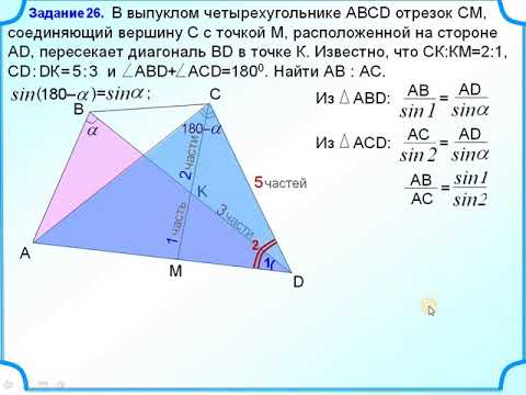 В выпуклом четырехугольнике ABCD отрезок СМ, соединяющий вершину С с точкой М, расположенной на стороне AD, пересекает диагональ BD в точке К. Известно, что СК:КМ=2:1, CD : DК = 5 : 3 и ﹤АВD+ ﹤ACD=180⁰. Найти АВ : АС.