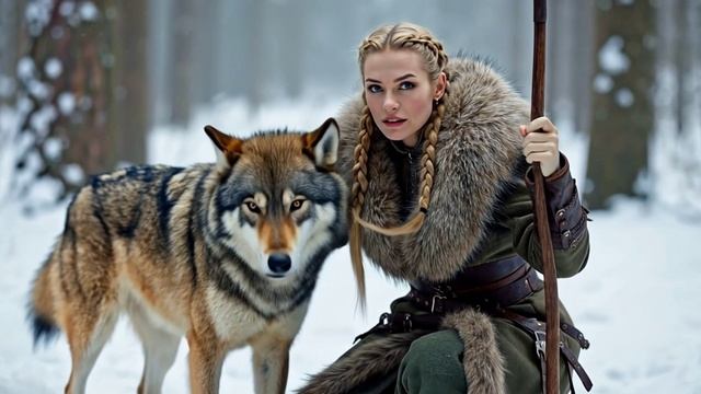 Скандинавская девушка гуляет с ручным волком в зимнем лесу!