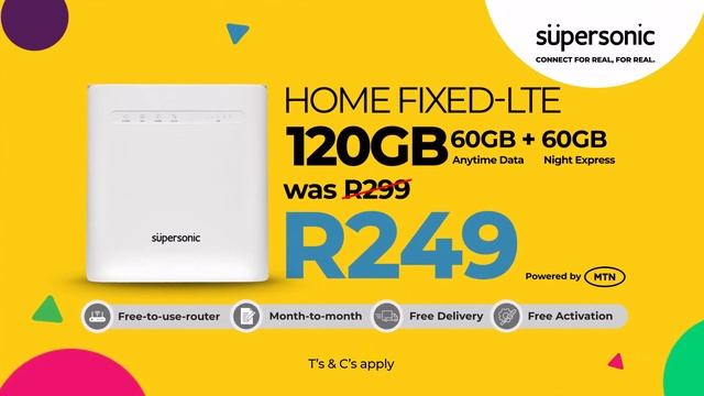 Twice is always nice! Enjoy 60GB day & 60GB night data on Supersonic’s Fixed-LTE package for only R249. No additional charges! Free-to-use-router Free Delivery Free Activation #Connect4real4real