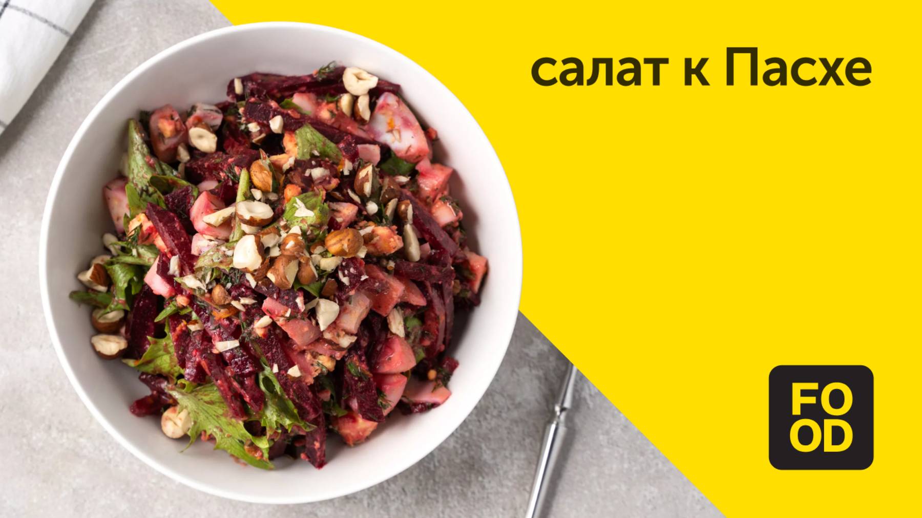Салат к Пасхе Это необычное блюдо из свеклы займет достойное место на праздничном пасхальном столе. Блюдо получается сытным, ярким и праздничным. Ингредиенты: • Свекла — 2 шт. • Укроп — 1 пучок • Куриное яйцо — 3 шт. • Цедра лимона — 1 ст. л. • Лимонный сок — 2 ст. л. • Мед — 2 ст. л. • Дижонская горчица — 1 ст. л. • Салат-латук — 100 г • Оливковое масло — 3 ст. л. • Соль — по вкусу • Черный перец молотый — по вкусу Для подачи: • Фундук — 30 г Пошаговый рецепт вы найдёте по ссылке: https://clck.ru/3LU9ET