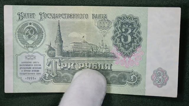 Бумажная купюра номиналом 3 рубля 1991 года была выпущена Государственным банком СССР. Основной цвет банкноты - зеленый, но присутствуют также синие, розовые и оранжевые оттенки. На лицевой стороне изображена гравюра с Московским Кремлем, а на оборотной - номинал "3 рубля" и надпись "Билет Государственного банка СССР". Банкнота имеет размеры 113 мм на 57 мм и водяной знак в виде волнистых полос и пятиконечных звезд. #звезды #знаки #водянойзнак #водяной_знак #деньги #бумажные #боны #бона