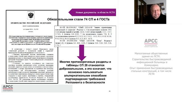 Ведущий: Камынин Сергей Владимирович Эксперт АРСС, дипломированный инженер-строитель, Почётный строитель РФ. Тема: Малоэтажные общественные здания из ЛСТК. Строительство быстровозводимой инфекционной больницы в Коммунарке. Опыт применения быстровозводимых стальных конструкций, в том числе ЛСТК. 1. Классификация: «каркасно-обшивные конструкции ЛСТК» и «рамные конструкции ЛСТК». Особенности производства и проектирования. 2. Конструктивные особенности каркасно-обшивных малоэтажных зданий с применением термопрофилей. 3. Саморезы: особенности проектирования и расчёта.