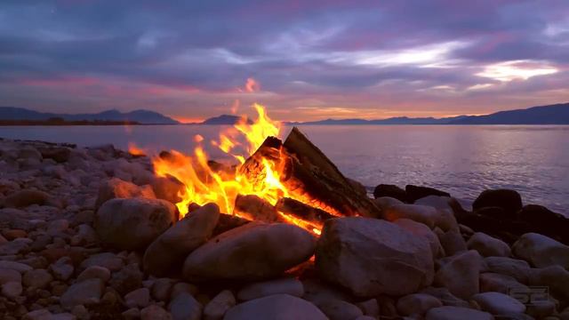 Расслабляющий костер у озера на закате. Снятие стресса, медитация и глубокий сон