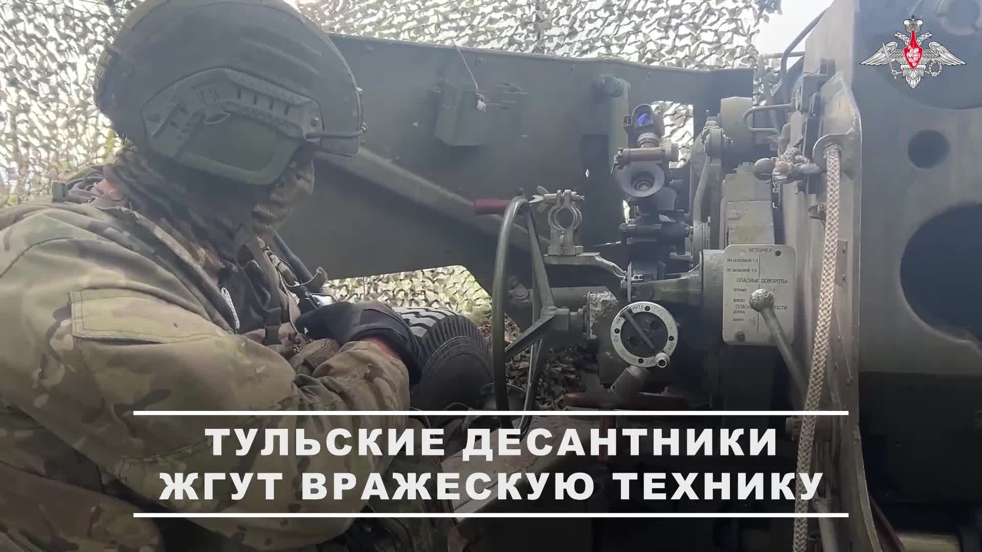 Расчет орудия «Гиацинт-Б» Тульского соединения ВДВ уничтожил замаскированное орудие ВСУ в ходе ведения контрбатарейной борьбы вдоль границы Курской области. 🔹 Минобороны России