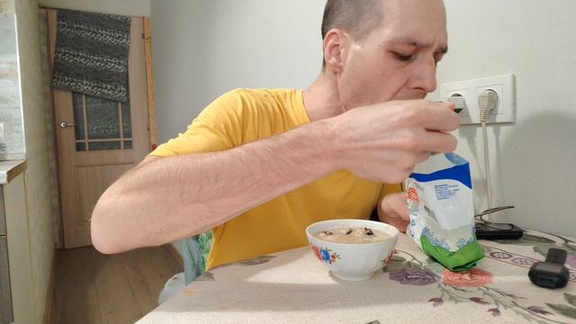 Ем на камеру кашу овсяную с черносливом.