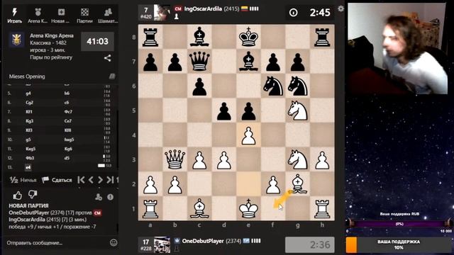 Друзья, всем привет. Партия со стрима, представляю вашему вниманию. Шахматы. Блиц 3+0 на chess.com. Если интересно, - подписывайтесь на канал, ставьте лайки, оставляйте комментарии. Поддержка через: DonationAlerts: https://www.donationalerts.com/r/onedebutplayer Бусти: https://boosty.to/onedebutplayer/donate Donatepay: https://new.donatepay.ru/@1272445