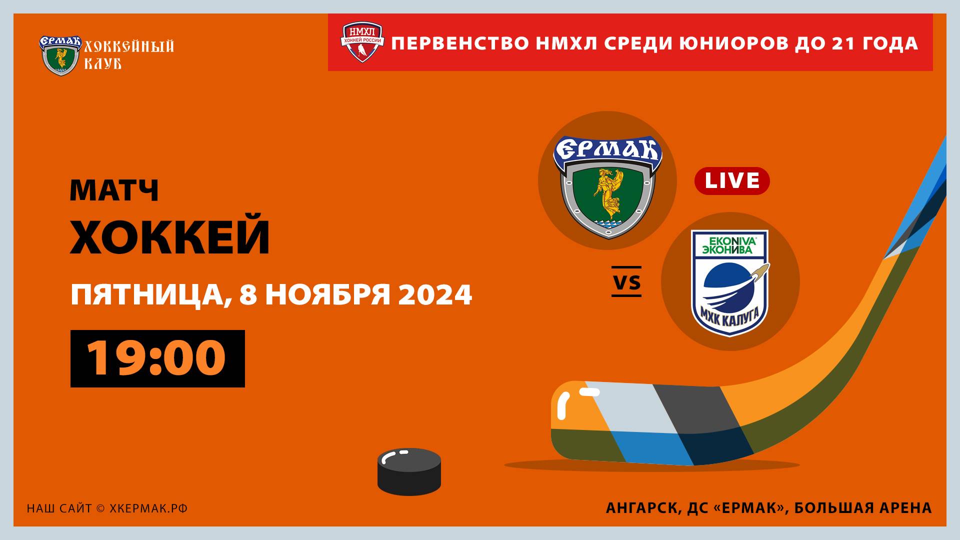 Матч между командами «Ермак» (Ангарск) и «Калуга» (Калуга) в рамках Первенства Национальной молодёжной лиги среди юниоров до 21 года. Конференция «Запад». Первый этап. Сезон 2024/25 годов. 8 ноября 2024 года. г. Ангарск, ДС «Ермак», большая арена