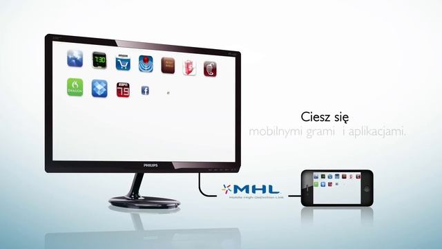 Opcjonalny kabel MHL umożliwia łatwe podłączenie urządzenia mobilnego obsługującego technologię MHL do tego dużego monitora MHL marki Philips. Nowe monitory IPS E-line marki Philips z technologią MHL są gotowe, by zapewnić Ci rozrywkę!