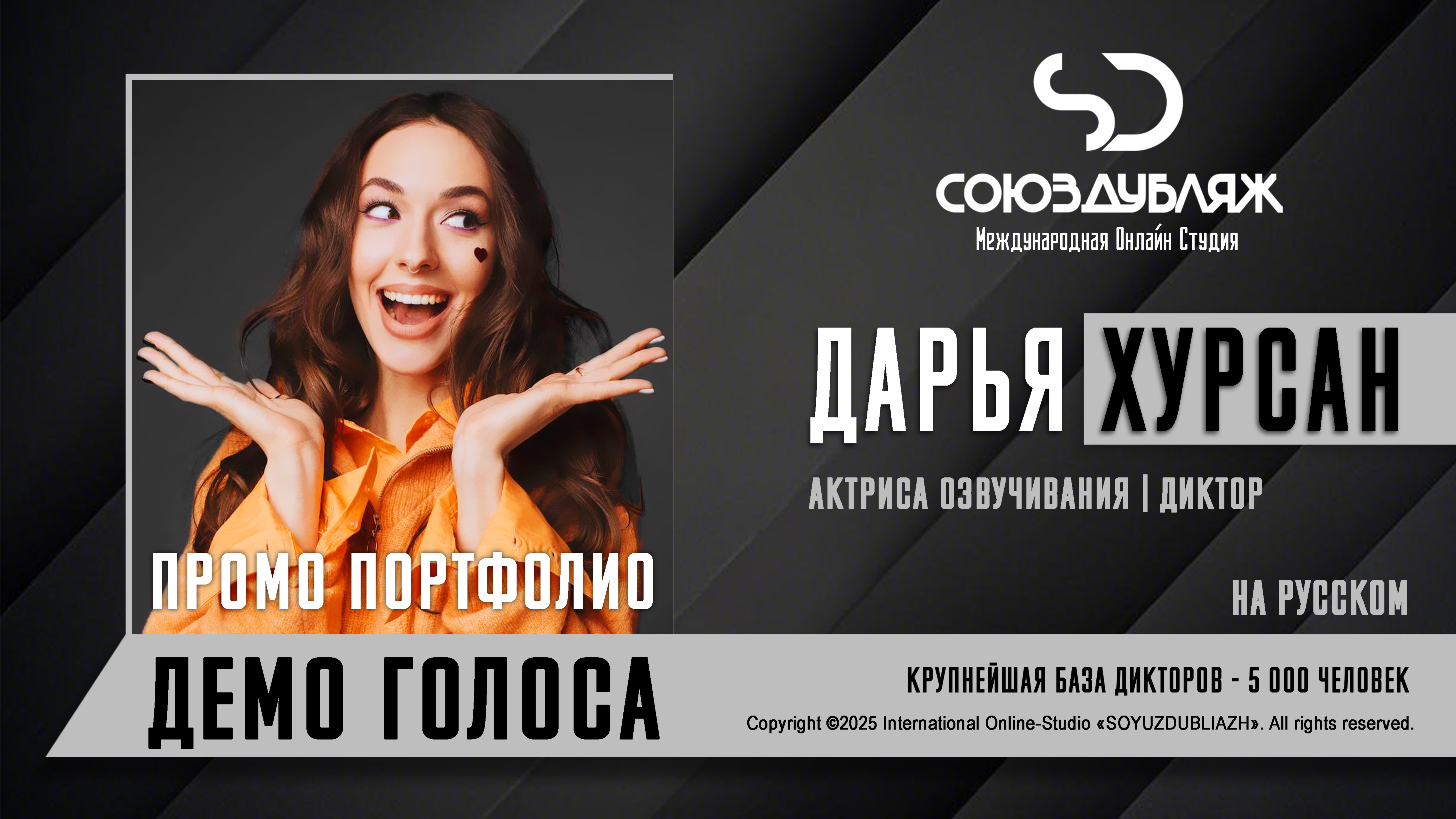 #СоюзДубляж #БазаДикторов #Озвучка ✔️Дарья Хурсан, актриса озвучивания-диктор. Международная Онлайн-Студия "СОЮЗДУБЛЯЖ" - профессиональная озвучка и дубляж. ▪️Рабочая группа в Телеграм: https://t.me/soyuzdubliazh ▪️Контакт для связи: https://t.me/SoyuzAdmin ▪️Подпишись:https://www.youtube.com/c/SOYUZDUBLIAZH ▪️Сайт: https://www.soyuzdubliazh.com/ Лучшие голоса для вашей аудиорекламы и видеороликов. База дикторов - 5 000 человек, профессионального уровня на ENG| FR| TR| RU| ISR| AZ| UA| KZ| UZ| языках. Мужские и Женские топовые голоса для озвучки любых проектов, таких как: Рекламы, Презентации, Фильмы, Сериалы, Игры, Мультфильмы, ТВ Шоу, Аудио-видео визитки. ✔️Сотрудничая с нами вы получаете свой проект под ключ, не выходя из дома или офиса. Наша слаженная команда из лучших дикторов, актёров озвучивания, режиссёров и звукорежиссёров в кратчайшие сроки озвучат или отдублируют ваш заказ на профессиональном уровне. Образцы работ нашего портфолио вы сможете посмотреть на канале СОЮЗДУБЛЯЖ. ВНИМАНИЕ: ✔️Мы приглашаем специалистов озвучки к сотрудничеству в нашей команде. Вы можете пройти по ссылке в наш телеграм канал и связаться с Админом для обсуждения. ✔️Всем заказчикам подобных медиа проектов по озвучки и дубляжу фильмов, сериалов, документалок обращаться непосредственно к Админу Телеграм группы СОЮЗДУБЛЯЖ, пройдя по ссылке: Проходи по ссылке: https://t.me/soyuzdubliazh International Online-Studio SOYUZDUDLIAZH presents a highly professional approach in voice-over and dubbing. ▪️Our working group https://t.me/soyuzdubliazh ▪️Chief manager https://t.me/SoyuzAdmin ▪️Follow https://www.youtube.com/c/SOYUZDUDLIAZH ▪️Web: https://www.soyuzdubliazh.com/ We offer You the best Voices for your Audio commercials and Video`s. Our Database contains over 5 000 voices of native speakers and high-class foreign language specialists in ENG| FR| TR| RU| ISR| AZ| UA| KZ| UZ|. Male & Female top level voices for all the variety of dubbing projects such as commercials, presentations, movies, TV-series, video and computer games, cartoons, TV-shows, audio & video portfolio’s – all in one place. As your business partner we guarantee a turn-key project without you leaving your house or office. Our target is to make sure that the dubbing of your project is made as quick as possible by a well-coordinated and professional team of the best speakers, film and sound directors. To whom it may concern! We invite dubbing specialists to join our team. Please contact our manager on Telegram https://t.me/soyuzdubliazh