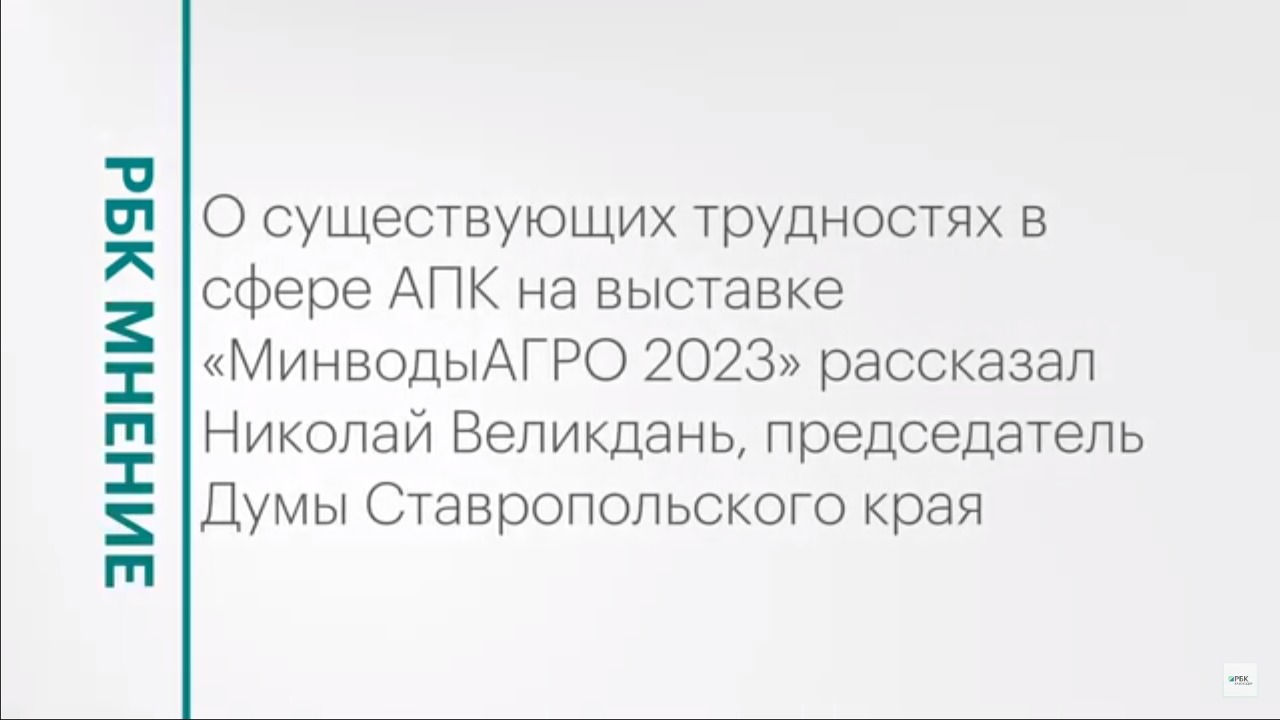 О существующих трудностях в сфере АПК на выставке «МинводыАГРО 2023» рассказал Николай Великдань, председатель Думы Ставропольского края. Подписывайтесь на нас в социальных сетях: ВКонтакте: https://vk.com/rbckuban Telegram: https://t.me/rbc_krasnodar Читайте новости, статьи и интервью на сайте РБК Кубань: https://kuban.rbc.ru/ Подпишитесь на канал, чтобы смотреть новые выпуски первыми!