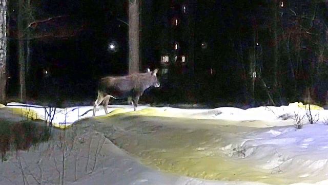 Днём лоси отдыхали недалеко от пляжа "Лесной" (при этом 11-летка всё лежал и лежал, а 5-летка всё порывался куда-нибудь пойти), а с наступлением вечера лоси разошлись: 11-летка направился куда-то в сторону собора, а 5-летка - в противоположную сторону. Здесь во 2-й части ролика лось-5-летка. В 1-й части стоит он же, а 11-летка лежит на снегу. А бабушка в конце ролика каждый вечер в это время моржуется в проруби в Лесном. Тут она возвращается с моржевания - домой идёт.