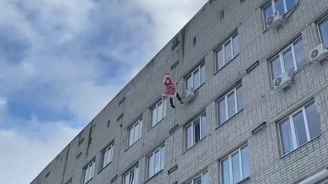 Поздравление ребят в детской воронежской больнице Дедом Морозом Спасателем, который спустился к ним с крыши