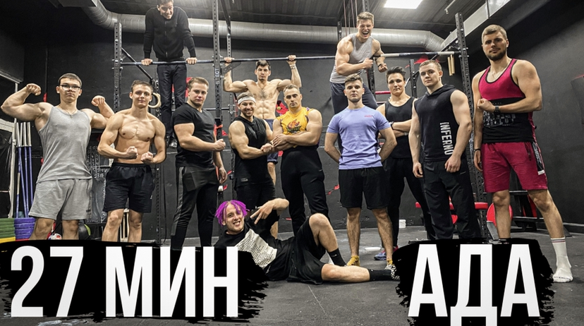 Команда Паши зарубается против команды Дениса в следующем комплексе: 1. Подьем переворотом - 100 2. Толчок гири 32 кг - 100 3. Становая тяга 80 кг - 150 4. Берпи через штангу - 150 Все это без остановки и на время