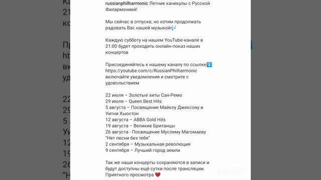 Всем добрый день. Прекрасная новость - Русская филармония открыла свой канал на Ютубе и теперь у каждого человека есть бесплатная возможность посмотреть любое выступление до покупки билетов, чтобы понять - на какой концерт вы готовы пойти. Я уже не первый год говорю,что такая открытая реклама будет гораздо лучше, чем запрет на фото и видео съёмку. Ведь когда много лет назад мы первый раз пришли на концерт Русской филармонии в Светлановский зал - песни группы ABBA и на следующий день аналогично на концерт - песни всех шведских групп, то мы были очень удивлены, что все это со словами,не только оркестр!!! Это было настолько круто!!! Так же - на всех концертах в Русской филармонии перед ним всегда директор говорила - что разрешено вести фото и видео фиксацию и выкладывать на все площадки с упоминанием хештег #русскаяфилармония Для чего это необходимо - первый вариант - для тех, кто может и планирует пойти на концерт - посмотрел и понимаешь чего ожидать. А самое главное - это второй вариант - ДЛЯ ТЕХ, кто живёт далеко от Москвы и у кого нет возможности посетить данные концерты, но у кого есть большое желание увидеть и услышать. По ТВ никогда это не показывали, а если где-то и было, то 10 минут концерта и 15 минут рекламы. А наша страна огромная и у большинства людей нет ни возможности, ни средств, чтобы изначально доехать до столицы, найти тут жилье, купить билет на мероприятие. Молодое поколение ещё быть может, но возьмите чуть старше. У нас есть до сих пор дома без воды и без газа , при этом там статус деревни. Необходимо учитывать все условия жизни всех людей. Очень радует, что данный поступок Русской филармонии сделал знак равенства между всеми жителями страны и показал, что они любят и уважают всех людей, а не только тех, кто может позволить себе личное присутствие в зале. Это очень благородный поступок!!! Всем здоровья и благополучия!!! #2023 #россия #ютуб #бесплатно #концерт #русскаяфилармония