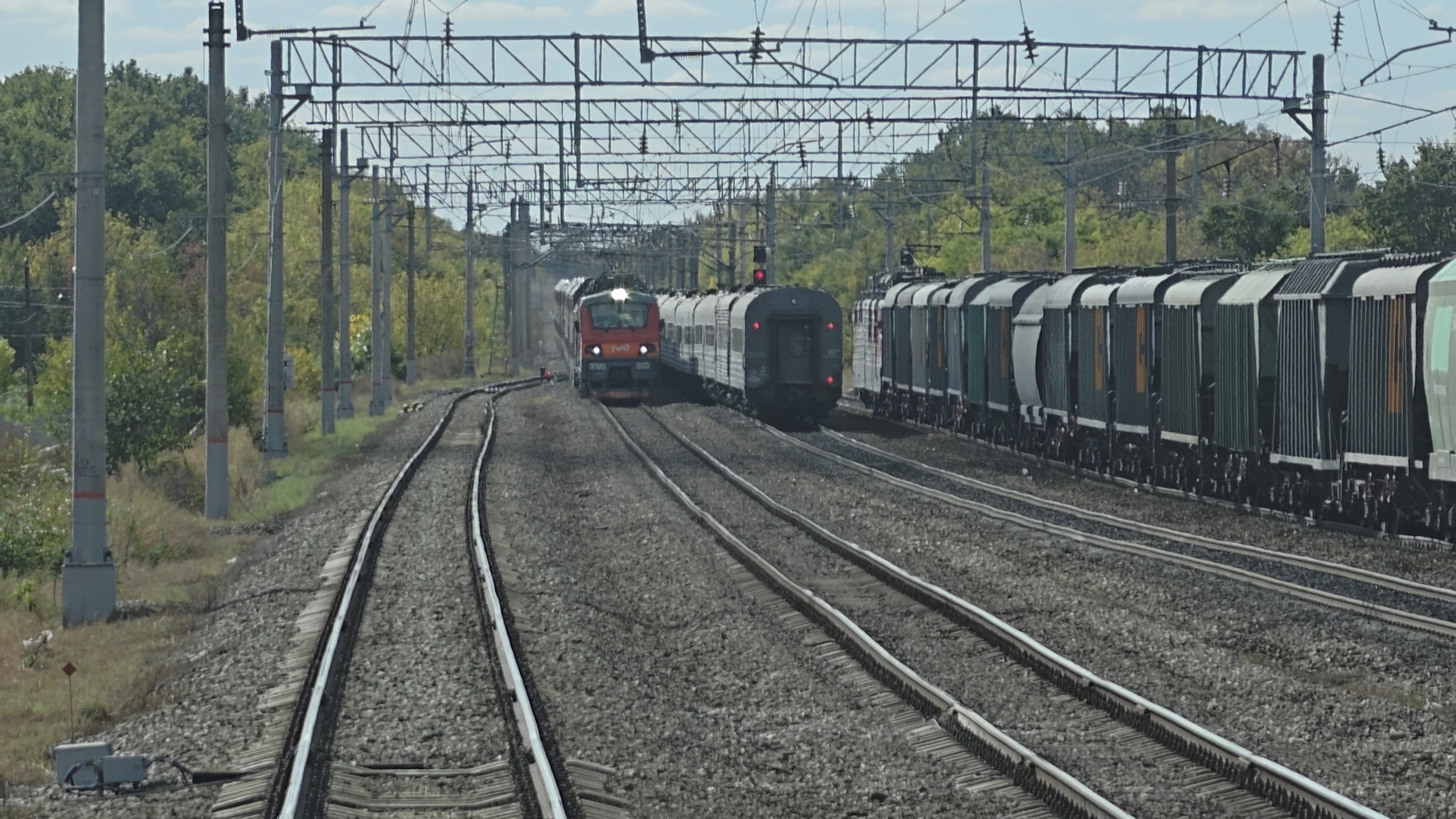 станция Перевальская Юго-Восточная железная дорога 27 сентября 2025 года в 11:06:10 поезда идут друг за другом, снято из поезда №84 Адлер-Москва