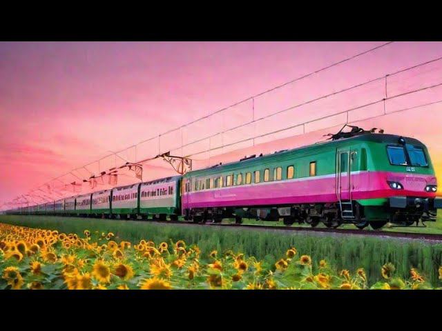 Пассажирский поезд, поле с подсолнухами и летний закат!