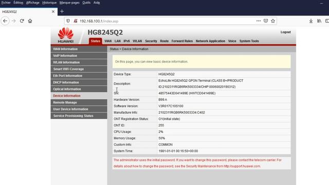 HWAWEI HG8245Q2 Dual Band 5G et 2.4G EchoLife EG8245Q WLAN: IEEE 802.11 b/g/n (2.4G) IEEE 802.11 a/n/ac (5G) 3 x 3 MIMO (2.4G/5G) Antenna gain: 2 dBi WMM/Multiple SSIDs/WPS 2.4G/5G concurrent Air interface rates: 450 Mbit/s (2.4G); 1,300 Mbit/s (5G) facebook :https://www.facebook.com/khadrouf.said
