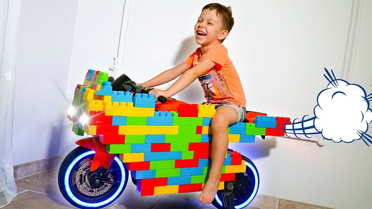 أرتيم وأمي يتظاهران باللعب مع ليغو ويركبان ألعاب الدراجة الرياضية للأطفال من باور ويلز Artem and Mom Pretend Play with LEGO and ride on Power Wheels Sportbike Toys for kids