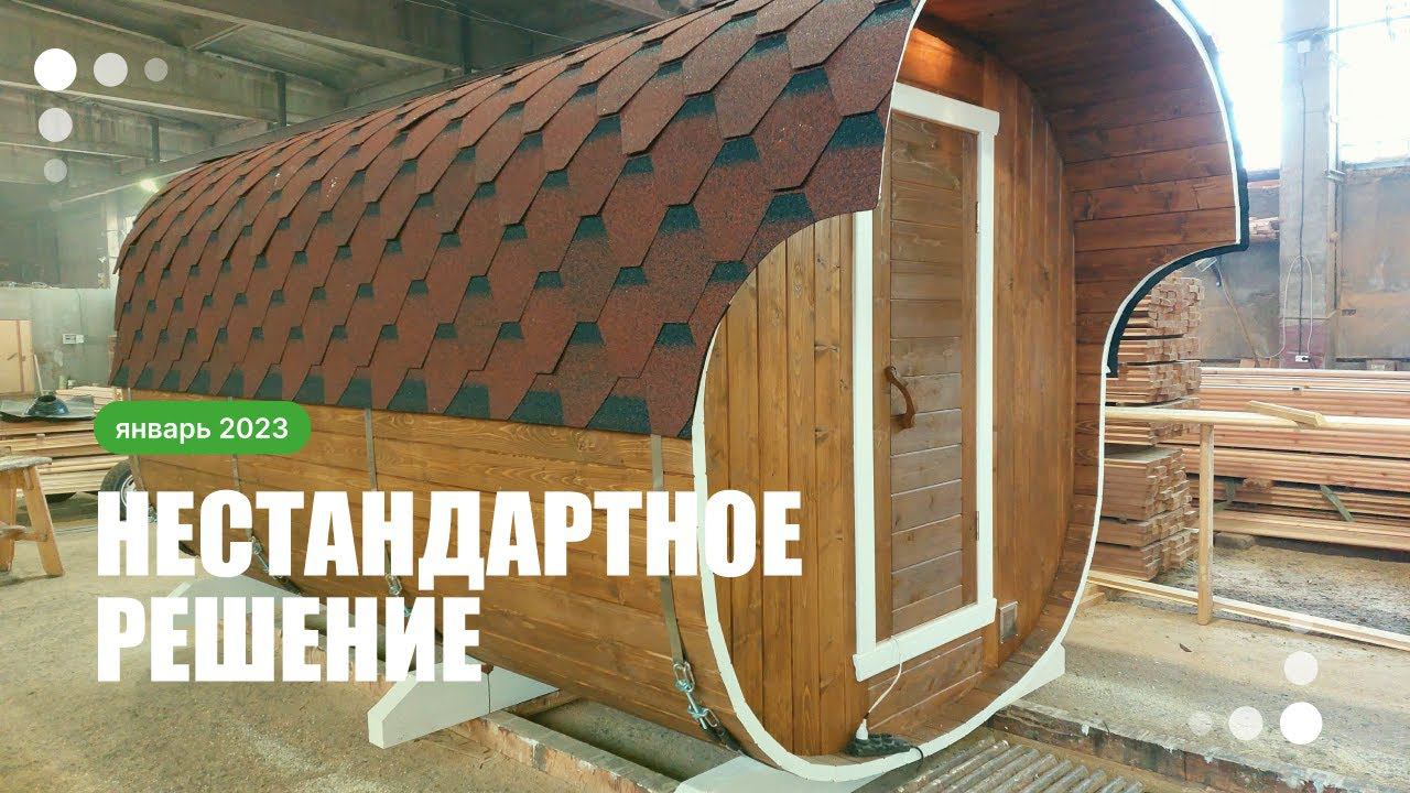 Вроде бы совершенно обычная квадратная баня бочка, но есть в ней одна интересная особенность. Заказчик попросил установить печь так, чтобы можно было топить из комнаты отдыха. В банях такого типа выносную топку делали впервые. Это возможно только в банях увеличенного диаметра – у этой, например, ширина 2,4 метра (а длина всего 4 метра). Хорошо получилось. Можно и так делать, если вам хочется.