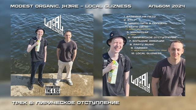 Modest Organic & Jh3Re - Local Glizness Треклист: 1. Вайбики на Лето 2. 64/7 3. Чикен Пита в Полдень 4. Было Дело (ft. Genadiii & yshelzapivom) 5. Макароны (ft. Vanya) 6. Лирическое Отступление 7. Большие Амбиции 8. Party Music 9. Сайфер (ft. yshelzapivom, Genadiii, F1LL & Vanya) 10. Local Glizness Prod.by Kusok Kolbasi & horrork1d WHYOUNG & ЖСГ 2024