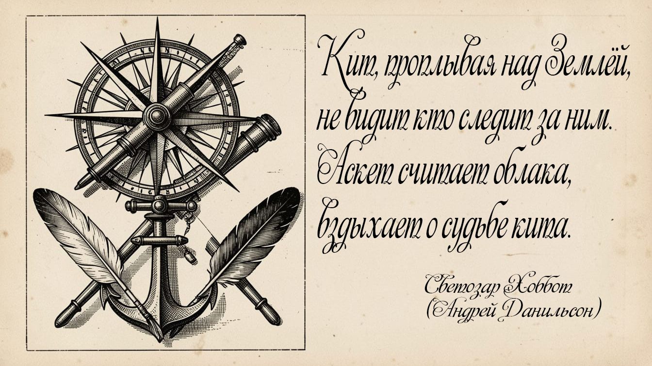 Кит, проплывая над Землей, не видит кто следит за ним. Аскет считает облака, вздыхает о судьбе кита. Но он не знает, кто спешит на встречу призрак или мим. Лишь солнце смотрит свысока, сжигая мнимой грусти грим. И все в движении всегда, «ничто не вечно под Луной». Струятся годы как вода, и жизнь становится золой. И тянут бревна муравьи, пытаясь обрести уют. Гуляют ветры на свои, дождями капли раздают. И эти капли слезы рек, не добежавших до морей. В тенях еще не стаял снег, не слился хрусталем в ручей. Мир в ожидании живет, то день, то ночь, за кругом круг. И кит за горизонт плывет, и солнце завершает круг. Аскету надоест считать и он вернется в явь китом. Но, а пока мы будем ждать, то, что появится потом. И муравьи найдут уют, дожди закончатся вот вот. Здесь все всегда чего-то ждут, и верят в новый горизонт. © Copyright: Андрей Данильсон, 2016 Свидетельство о публикации №116101102035 Все права на песню принадлежат мне. #оркестрсветозарахоббота #сунотрек #русскаярокмузыка #авторскаялирика #неформат #поддержинезависимых #роликипроразмышления #новаямузыка