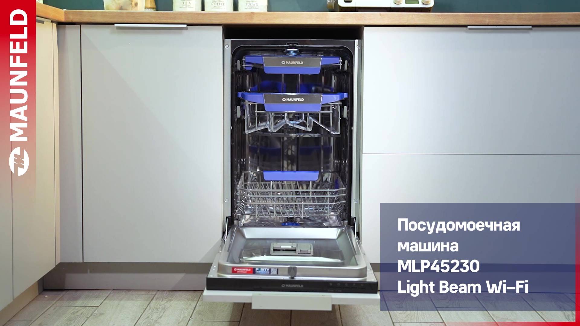 MAUNFELD MLP45230 Light Beam— это узкая модель, шириной 45 см (вместо классических 60 см), но весьма вместительная. За раз она может вымыть сразу много посуды, до 10 комплектов — это оценят в больших семьях, а также те, кто любит готовить, часто принимает гостей. Внутреннее LED освещение облегчает удобство загрузки и выгрузки посуды. Wi-Fi модуль с управлением через мобильное приложение MLP45230 Light Beam Inverter Wi-Fi избавит вас от необходимости мыть посуду вручную. В машине максимально эффективно организовано внутреннее пространство. Есть удобная корзина для столовых приборов и мелкой утвари. Верхняя корзина — с изменяемой высотой установки, чтобы можно было мыть посуду разного размера и объёмов. В верхней корзине есть складные держатели для бокалов — дополнительное важное удобство. Предусмотрены несколько программ мытья для посуды разной степени загрязнения. В режиме «Интенсивная мойка» обеспечена обработка посуды очень горячей водой — для максимально качественного результата. Отложенный старт поможет запустить мытьё в удобное время, например, ночью, когда дешевле электроэнергия. Посудомоечная машина MAUNFELD MLP45230 Light Beam Inverter Wi-Fi— помоет посуду без вашего участия, освобождая время для более приятных занятий. Программы: • Автоматическая программа • Интенсивная программа • Стандартная программа • Экономичная программа • Программа «90 минут» • Быстрая программа Система «Луч на полу» особенно актуальна для встраиваемых моделей, так как во время работы информационный дисплей машины скрыт под столешницей. При использовании этой системы на пол проецируется световой луч синего цвета, показывающий, что устройство работает. Луч гаснет, когда цикл завершен. Меньше шума, меньше беспокойства Благодаря специальному материалу камеры из нержавеющей стали создается гораздо меньше шума. Она абсорбирует вибрацию, за счет чего работает тихо, всего на уровне 47 дБ, что тише обычного разговора. Экономьте время с быстрой мойкой Программа быстрой мойки позволяет добиться идеальной чистоты всего за 30 мин., экономя ваше время. Эта программа подойдет для посуды, у которой нет сильных загрязнений, и всего через 30 мин. посуда будет чистой и сухой. Функция Aqua Stop Защититесь от протечек воды с функцией Aqua Stop. При обнаружении неполадки подача воды и электричества прекращается, останавливая работу посудомоечной машины и тем самым исключая возникновение короткого замыкания и протечки Загрузка 10 комплектов посуды В посудомоечную машину помещается много посуды. Можно накопить её в течение дня или помыть сразу всё после семейного торжества или вечеринки с друзьями. Вместимость — до 10 комплектов посуды. Дополнительная сушка Улучшает качество сушки посуды,за счёт увеличения температуры на последнем этапе полоскания увеличения времени сушки. При включении функции на дисплее будет подсвечен соответствующий индикатор. ФУНКЦИЯ DUAL ZONE (двухзонная мойка) В данной модели посудомоечной машины реализована функция Dual Zone, которая позволяет осуществлять мойку посуды отдельно только в нижней или только в верхней корзине. Автоматическое открывание двери